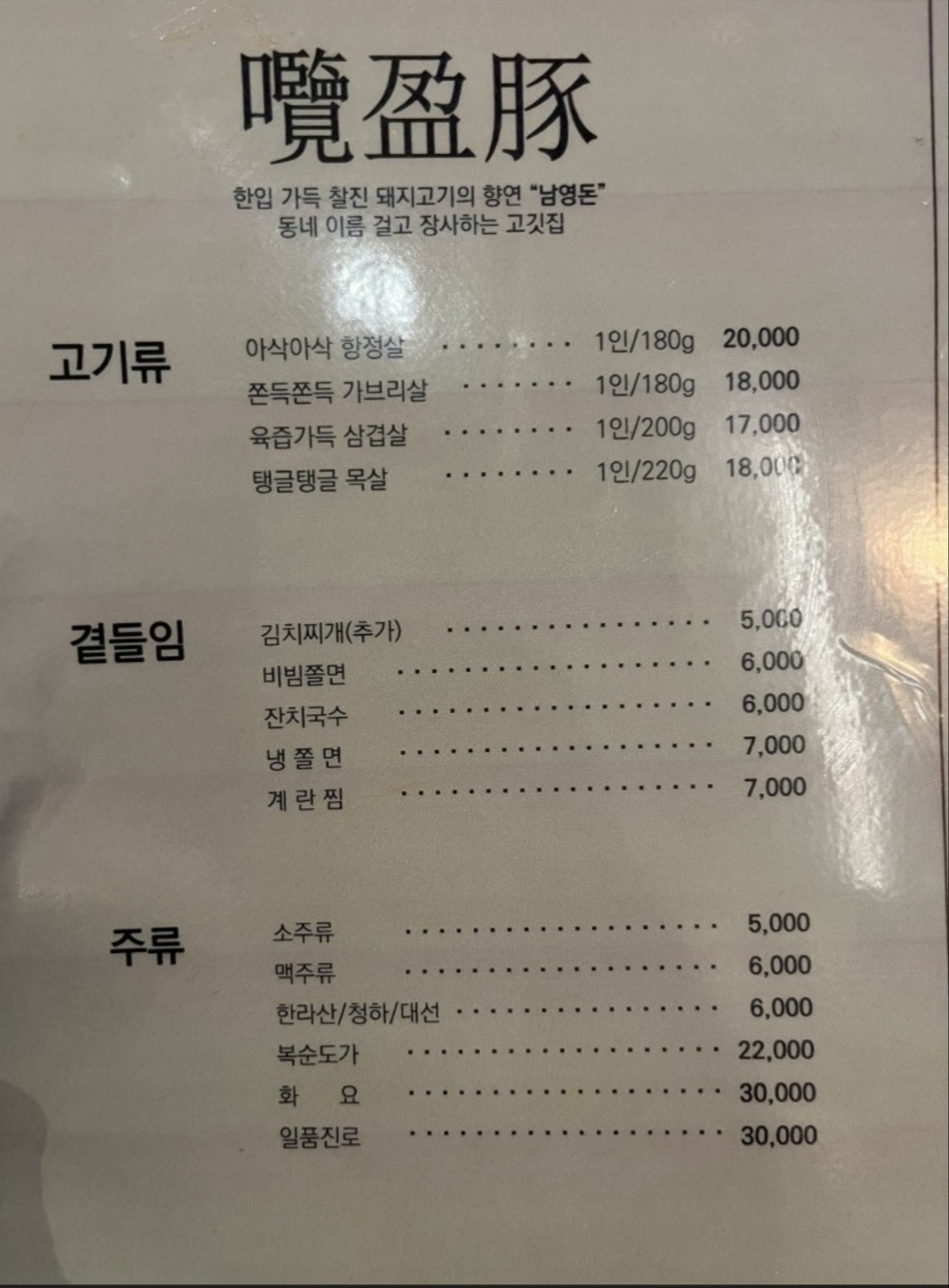 메뉴판은 보기와 같이 간단합니다. 항정살을 메인 메뉴로 판매하고 있고, 일반적인 삼겹, 목살도 있습니다.