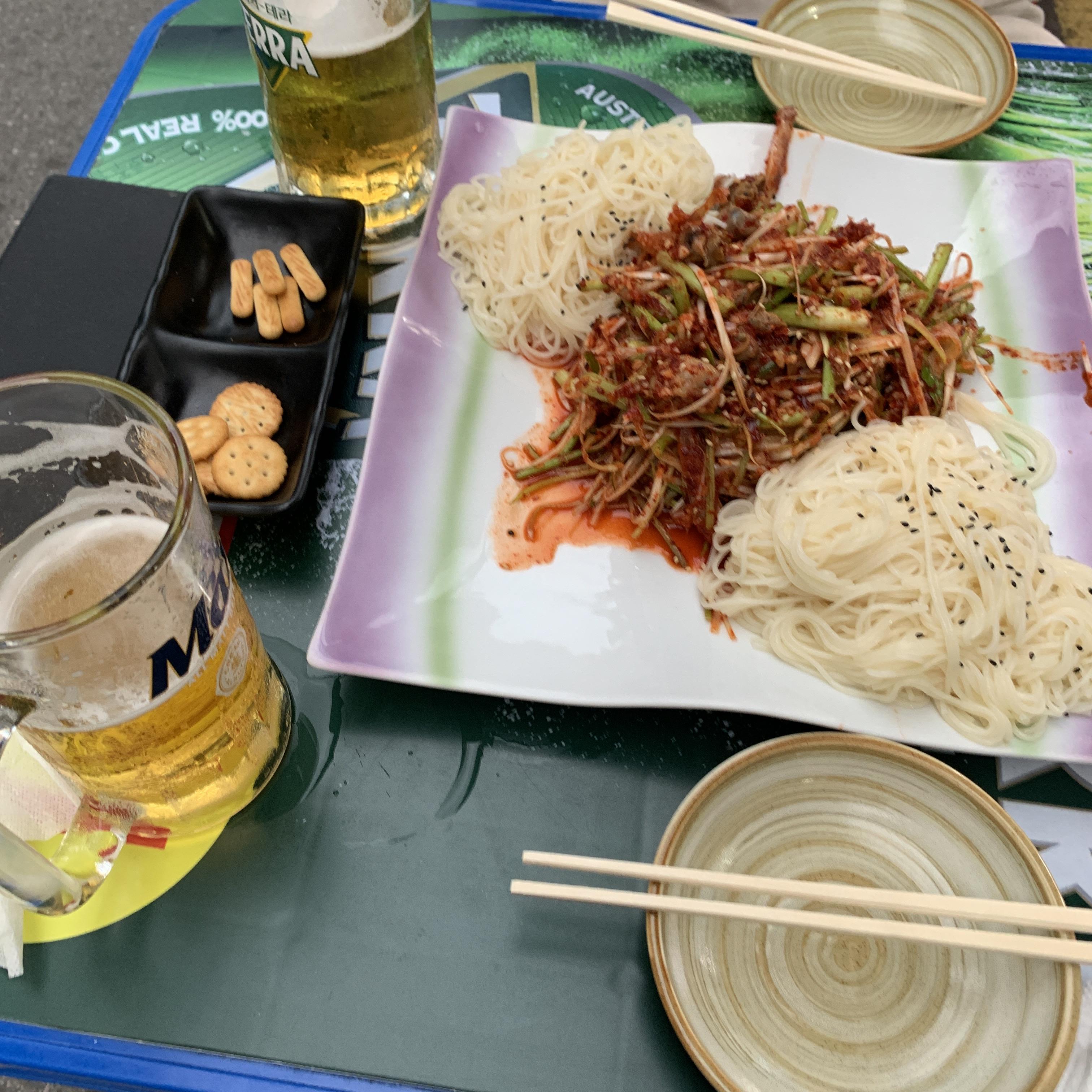 ゴルベンイを頼んだら、こんな形で出てきます。今日は軽くいっぱいっていって、ほかのメニューは頼んでないのですが、どんな店をいっても一緒だと思います。このゴルベンイムチムというものは、少し辛めの、しょっぱい味も入っています。いろんな野菜とサザエが入ってるので、健康にもいいかと。そのまま食べてもいいし、素麵を混ぜて食べてもいいです。